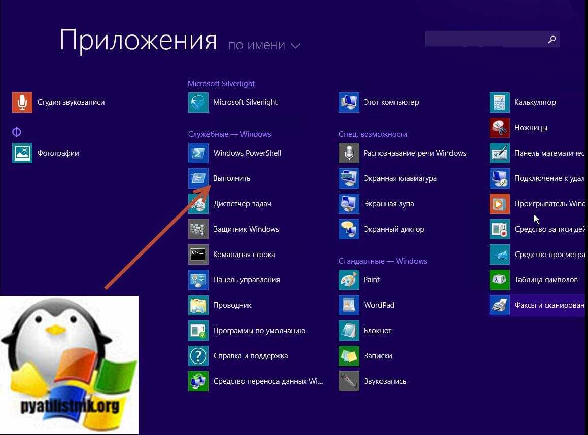 Так же ищем раздел «Служебные — Windows» в котором будет ярлык на диалоговое окно «Выполнить».
