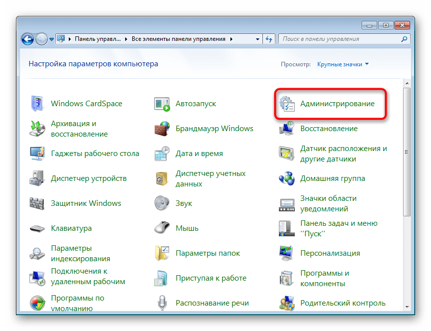 - В открытой «Панели управления» найдите значок «Администрирование» и нажмите по нему. Если тип просмотра установлен не «Значки», а «Категория», сперва перейдите в «Система и безопасность» и уже там в самом низу нажмите по выделенному большими буквами слову «Администрировании».