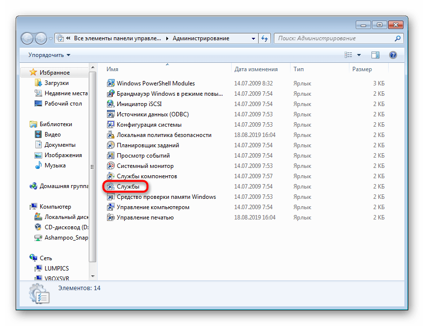 Запуск оснастки «Службы» в Windows 7