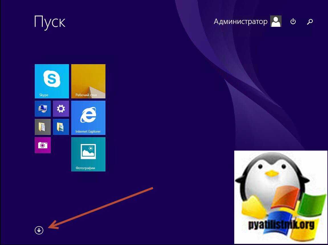 Если у вас Windows 8.1 или Windows Server 2012 R2, в пуске находим кнопку со стрелкой вниз.