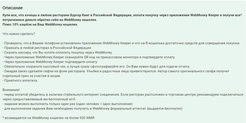 Яркий пример — недавнее задание на буксе Cashbox. Нужно было пообедать в Burger King, оплатить с помощью Webmoney и прислать чек. За это автор задания компенсировал полную сумму заказа (до 500 рублей) и платил 200 рублей сверху. Я лично знаком с человеком, который выполнил это задание 60 раз.
