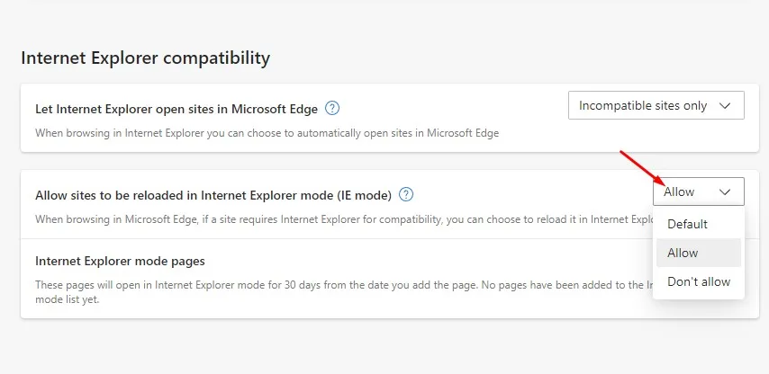 3. Далее с правой стороны нажмите на выпадающее меню рядом с « Разрешить перезагрузку сайтов в режиме Internet Explorer (режим IE) «Выбирать» Разрешать