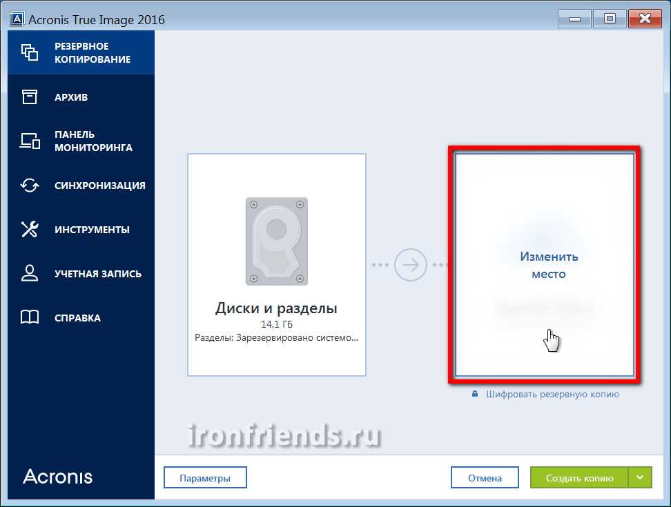 Теперь нужно выбрать место, где будет располагаться резервная копия.