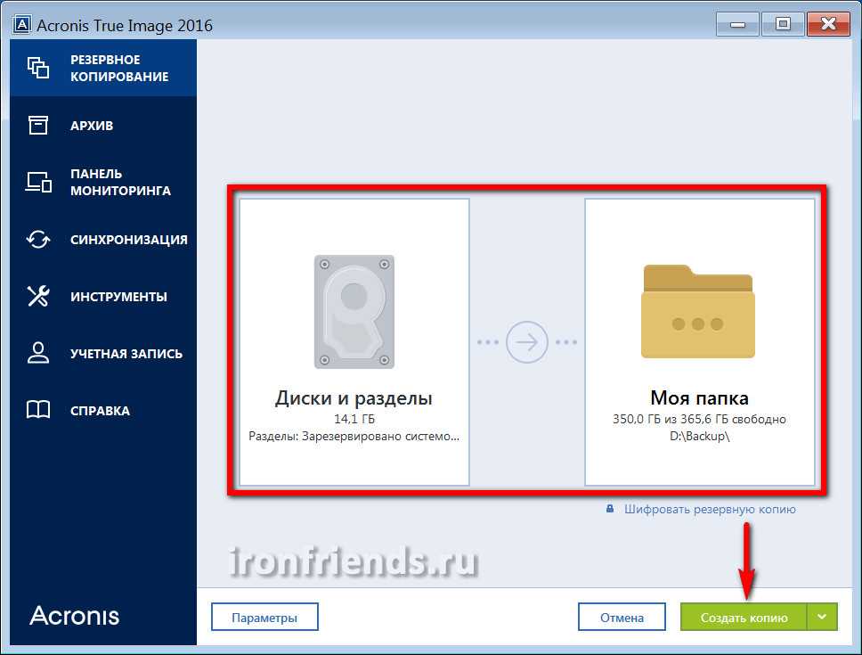 После того как вы выбрали разделы для резервного копирования и расположение резервной копии нажмите «Создать копию».