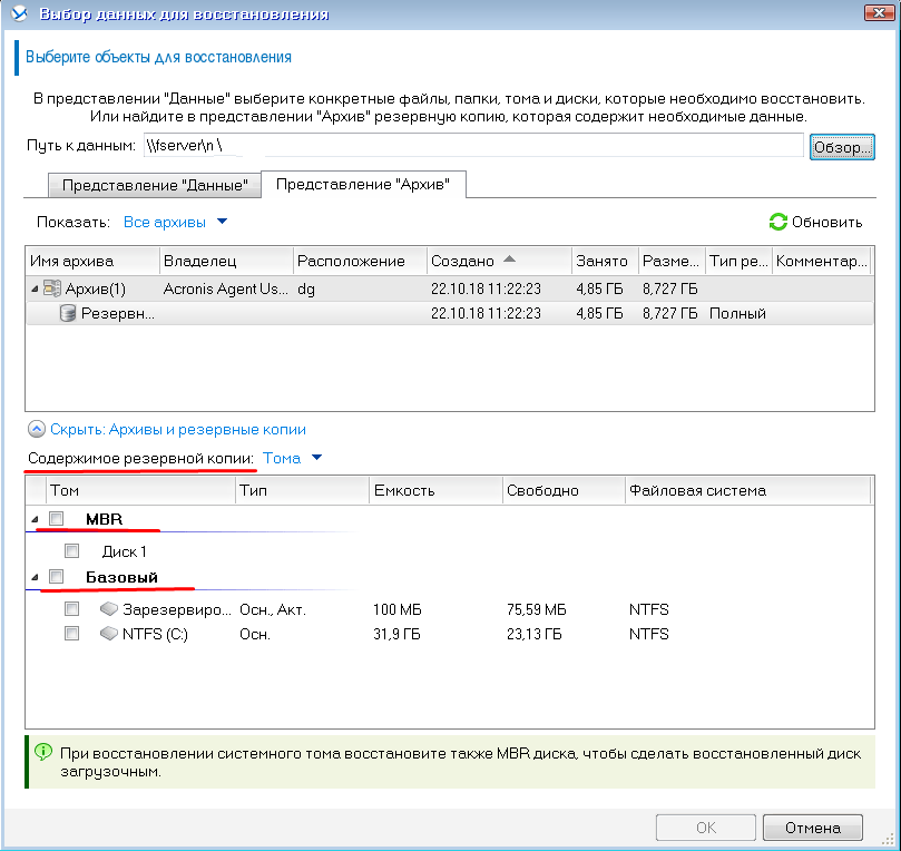 дифференциальной версии резервной копии программа проверит первоначальную полную версию резервной копии и выбранную версию дифференциальной резервной копии;