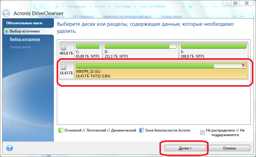 Перед нами отрывается окно утилиты. Здесь нужно выбрать диск, раздел диска или USB-носитель, который нужно очистить. Для этого достаточно сделать один клик левой кнопкой мыши по соответствующему элементу. После выбора, жмем на кнопку «Далее».