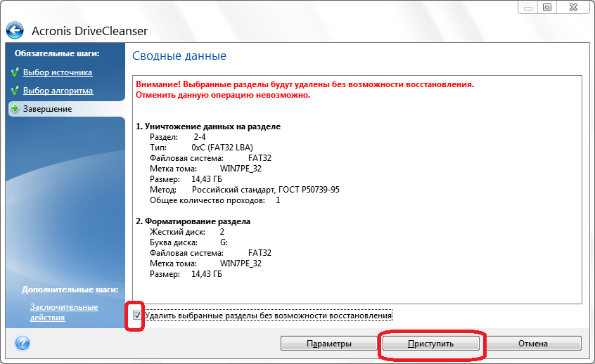 После этого, открывается окно, в котором предупреждается, что данные на выбранном разделе будут удалены, а сам он отформатирован. Ставим галочку около надписи «Удалить выбранные разделы без возможности восстановления», и жмем на кнопку «Приступить».