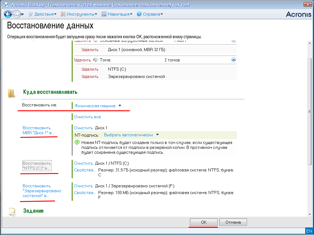 Теперь мы снова два раза нажимаем на судьбоносную кнопку «Далее». При появлении вкладки MBR следует указать то место, в котором мы хотим восстанавливать загрузочную область. И здесь нужно выбрать то место, откуда этот образ снимался. И опять «Далее». «Приступить».