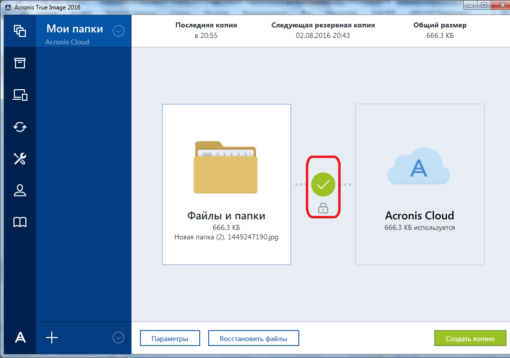 После этого, запускается процесс резервного копирования, который может быть продолжен в фоновом режиме, пока вы занимаетесь другими делами. После завершения процедуры резервного копирования, в окне программы между двумя точками соединения появляется характерный зеленый значок с галочкой внутри.