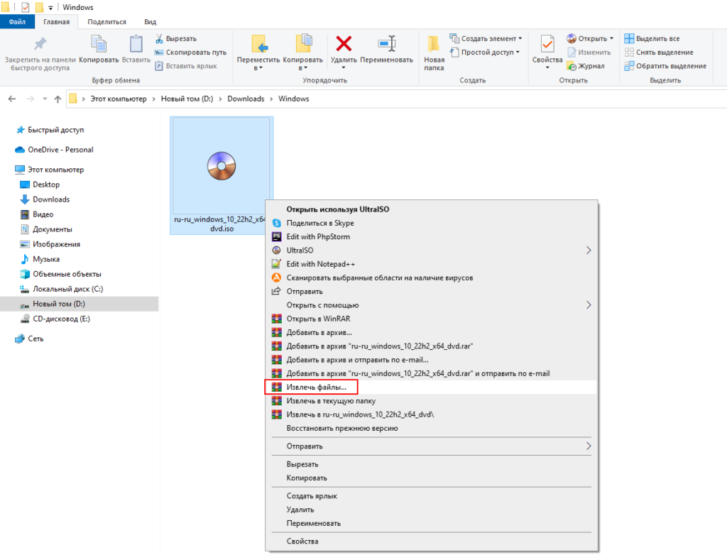 После скачивания образа 10-ки, мы должны найти его на ПК. Для извлечения файлов (например, с помощью WinRAR), нажмите правой кнопкой мыши на образ с расширением .iso и выберите в появившемся меню пункт «Извлечь файлы».