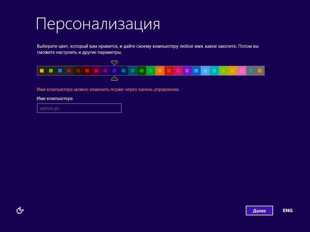 После того, как установить Windows 8.1 удалось, и компьютер успешно перезагрузился, начнётся этап настройки. Сначала нужно выбрать цвет интерфейса и дать компьютеру имя. При необходимости эти параметры потом можно будет поменять.