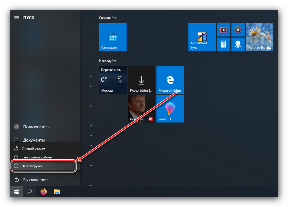 - Если система загружается и работоспособна, воспользуйтесь одним из способов входа в загрузочное меню — например, перейдите по пути «Пуск» — «Выключение», затем зажмите клавишу Shift и кликните «Перезагрузка».