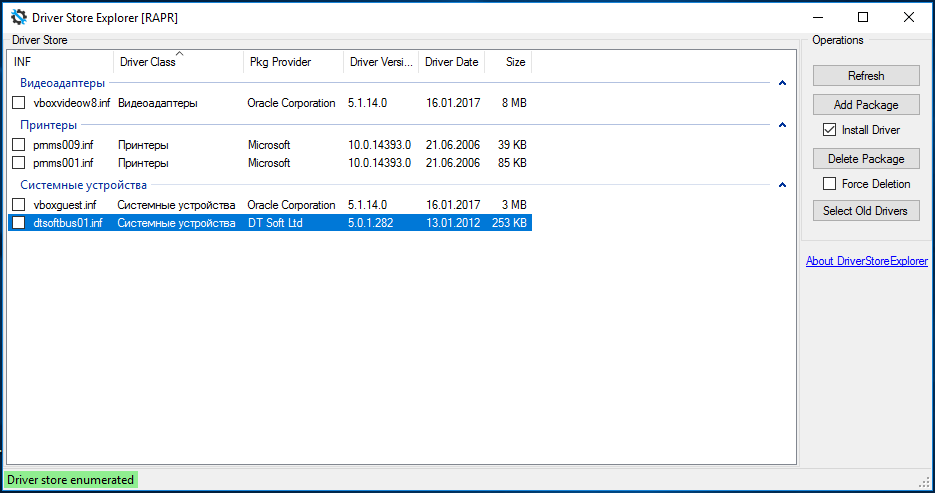 Приложение для работы с хранилищем драйверов Windows (Driver Store). Поддерживаются операции: перечисление, добавление пакета драйверов и установка, удаление и принудительное удаление из хранилища драйверов. Полностью на русском языке .