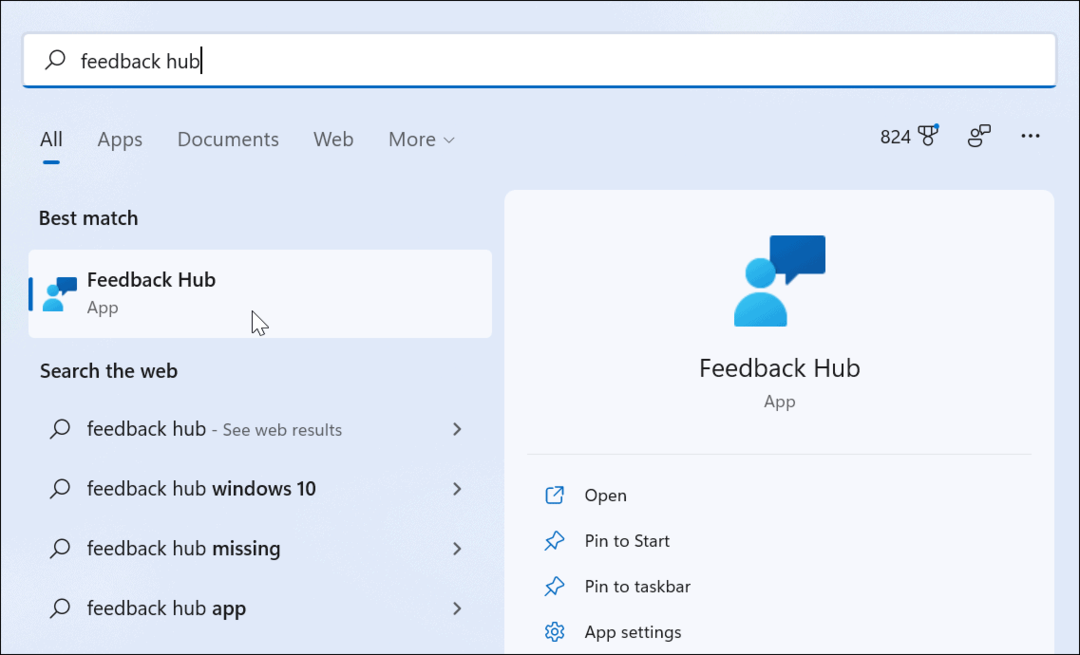 - нажмите Клавиша Windows и введите центр обратной связи.