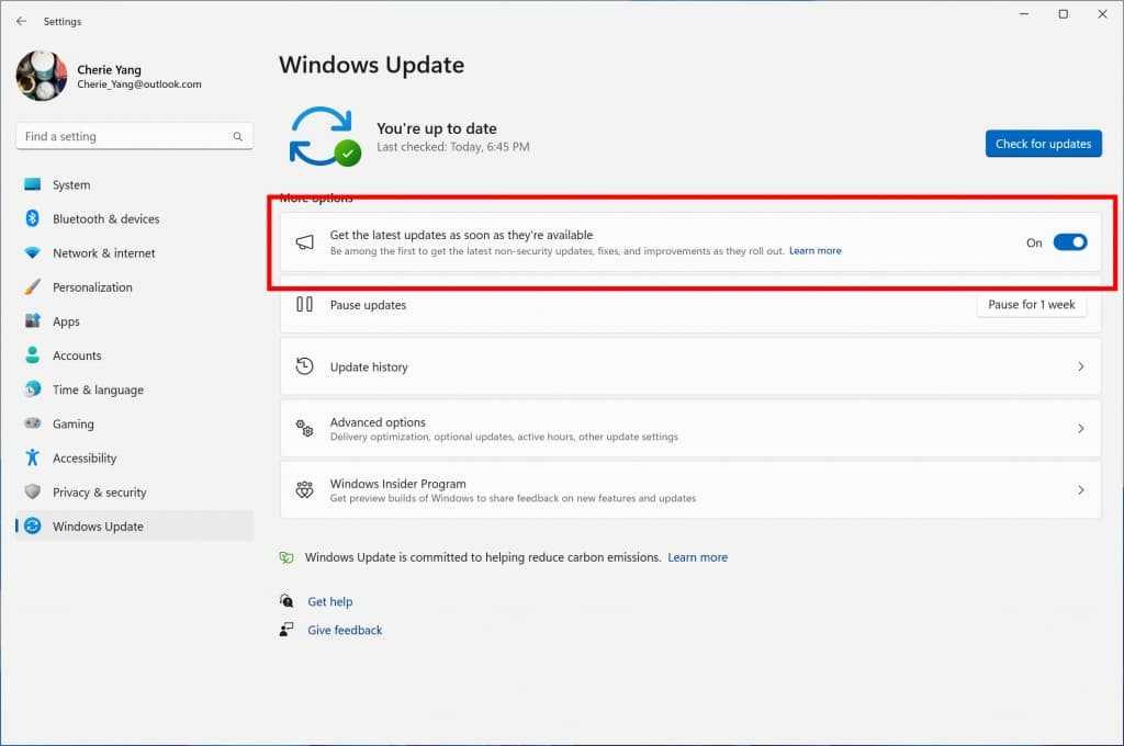 To receive the Windows configuration update, you must first go into Settings > Windows Update, enable the ‘Get the latest updates as soon as they’re available‘ setting, and then click on the ‘Check for updates button.