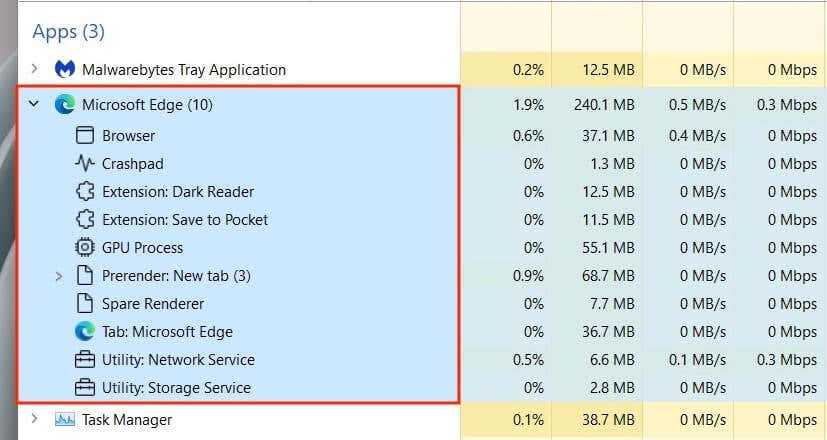 По умолчанию диспетчер задач группирует и скрывает подпроцессы, связанные с каждой программой. Чтобы открыть их, просто дважды щелкните имя программы или выберите крошечный значок стрелки рядом с ним.
