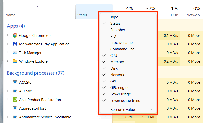 Тип: отображает категорию процесса. — Приложение, Фоновый процесс или Процесс Windows. Издатель. Показывает издателя соответствующей программы или службы, например Microsoft. PID: уникальный десятичный номер, назначаемый каждому процессу, помогает различать несколько экземпляров одной и той же программы. Имя процесса:  показывает имя файла и расширение процесса.Командная строка: отображает полную командную строку, параметры и переменные, связанные с процессом.GPU: активность GPU в процентах для каждого процесса.GPU Engine: Отображает ядро графического процессора, активно используемое процессом — 3D, Видео, Декодирование, Обработка видео и т. д. Энергопотребление: энергопотребление процесса по шкале Очень низкое, Низкое, Умеренное,  Высокий и Очень высокий в любой момент времени. Тенденция энергопотребления: энергопотребление процесса в среднем. Это лучший индикатор, так как он учитывает время.Значения ресурсов: это позволяет вам изменить Память, Диск и Сеть<.> для отображения значений вместо процентов.