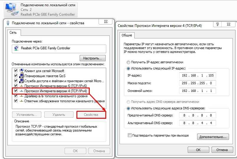 - Нажимаем один раз на 4 протокол IP и далее кликаем на кнопку «Свойства». Если два компьютера подключены к одному маршрутизатору, то лучше отталкиваться от его настроек. То есть первые 3 цифры пишем, как у шлюза (роутера). Я в качестве эксперимента указал IP: 192.168.1.105. Ниже маска указывается автоматически. Также не забываем указать IP шлюза. Я в качестве сетевого оборудования использую домашний роутер, у которого IP адрес: 192.168.1.1. Если шлюз подключен к интернету, то можно также указать DNS – я указал ДНС от Google: 8.8.8.8 и 8.8.4.4.