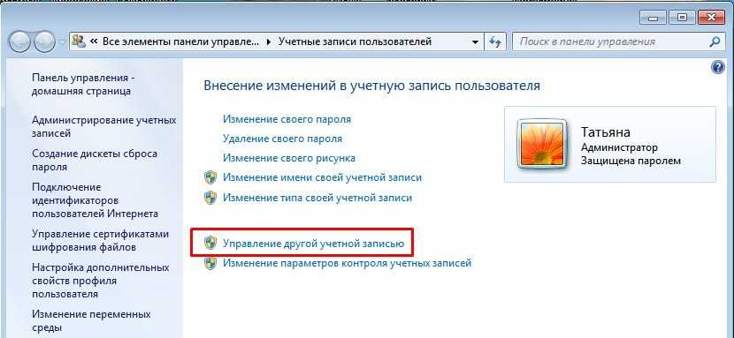 - Как видите, тут есть только одна учетная запись – «Татьяна» (Администратор). Нажимаем «Управление другой учетной записью».