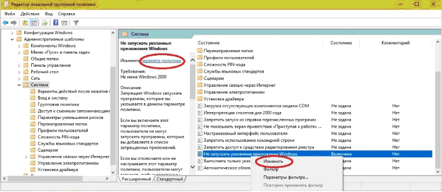 Отключение блокировки приложений в редакторе локальной групповой политики