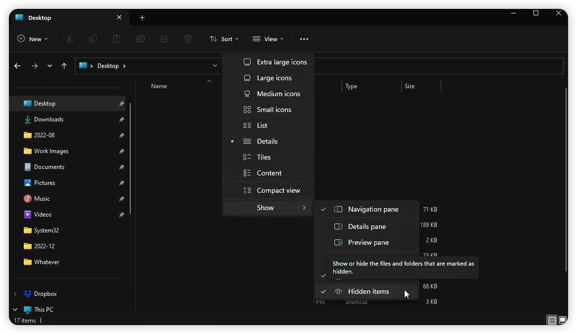Щелкните Вид > Показать и выберите Скрытые элементы. Убедитесь, что опция «Скрытый элемент» отмечена галочкой.