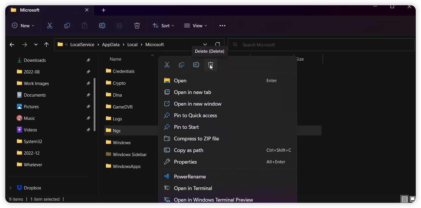 - Затем щелкните правой кнопкой мыши папку Ngc и выберите «Удалить». Нажмите Удалить еще раз, чтобы подтвердить действие.