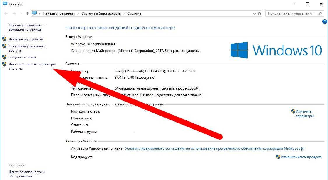 У вас откроется новое окно, в котором в левом столбце необходимо найти «Дополнительные параметры системы» и кликнуть по этому пункту: