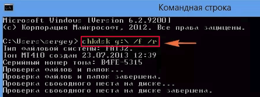 Естественно, f: нужно будет заменить актуальным названием диска. Параметр /f означает исправление ошибок во время сканирования.