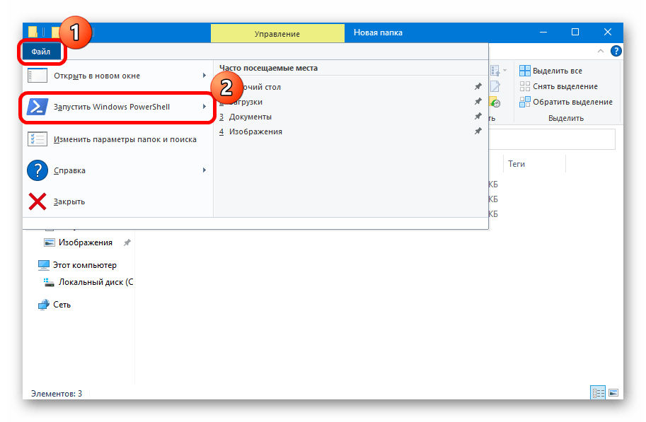 Есть еще несколько комбинаций команд, которые выполняются через консоль Windows PowerShell. Чтобы открыть каталог в ней, перейдите к файлам в папке через «Проводник», нажмите на вкладку «Файл» и выберите пункт «Запустить Windows PowerShell».