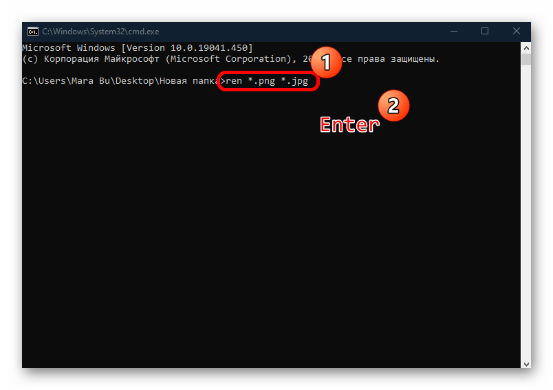 - Когда появится окно командной строки, добавьте команду ren вместе с текущим типом файла и типом файла