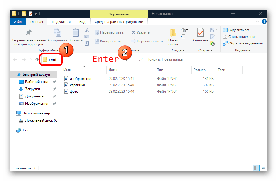 - Перейдите через «Проводник» к папке, где хранятся файлы, расширение которых вы хотите изменить. В адресной строке введите и нажмите на клавишу «Enter», чтобы сразу открыть адрес в интерфейсе «Командная строка».