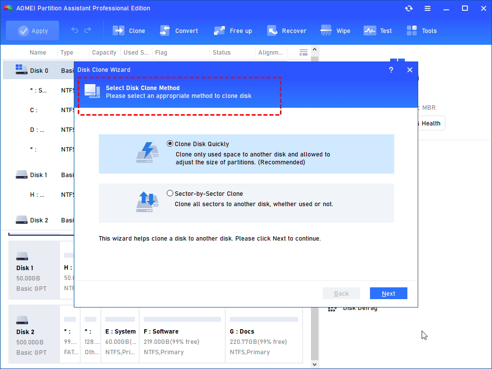 «Clone Disk» creates an exact replica of the entire disk, including the OS, applications, and data, facilitating disk replacement or capacity upgrades. Also, you can choose “Clone Disk Quickly”, which copies only the used sectors to the destination location. The target disk can be smaller than the source disk. Or “Sector-by-Sector Clone”, which copies all sectors, even if the sector is blank or has a logically bad sector, from the source disk or partition to the destination location, ensuring that the destination hard disk/partition is exactly the same as the source hard disk/partition.