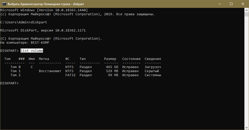 - list volume — запомните название системного раздела.