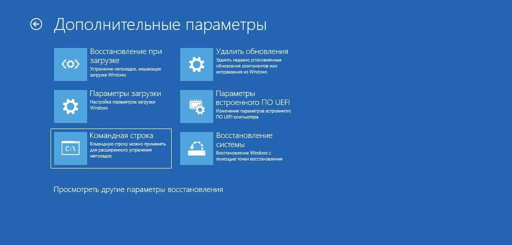 Есть и второй вариант проверки – через командную строку. Для этого вам необязательно запуска ОС с поддержкой командной строки. В уже знакомой вам ранее среде восстановления, где вы выбирали варианты загрузки, зайдите в раздел «Поиск и устранение неисправностей» -> «Дополнительные параметры» -> «Командная строка».