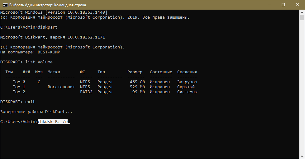 В колонке «Имя» будет указана буква. Чтобы выйти из утилиты, необходимо ввести «exit». После этого можно наконец запустить проверку: