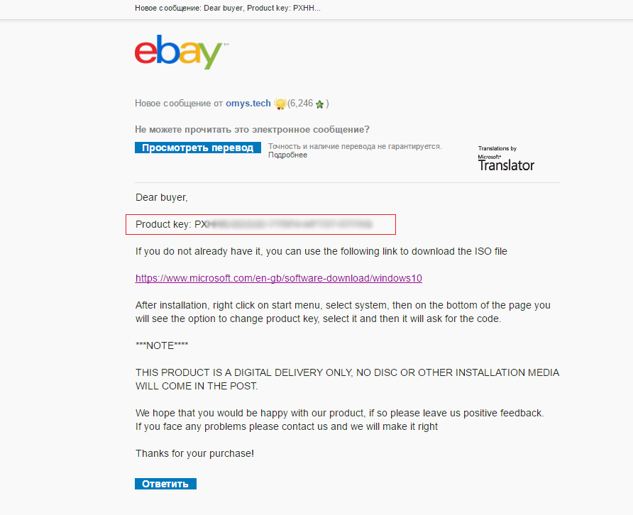 Регистрируемся на аукционе eBay и вводим в строку поиска «Windows 10 Pro». Нашему взору открывается большой выбор товаров, цена которого сильно разнится. Но брать нужно у того продавца, где самый большой рейтинг и много положительных отзывов.