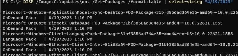 After the updates have been installed, you can verify that the updates have been successfully integrated into the Windows image. List the updates that have been installed today on a mounted Windows WIM image