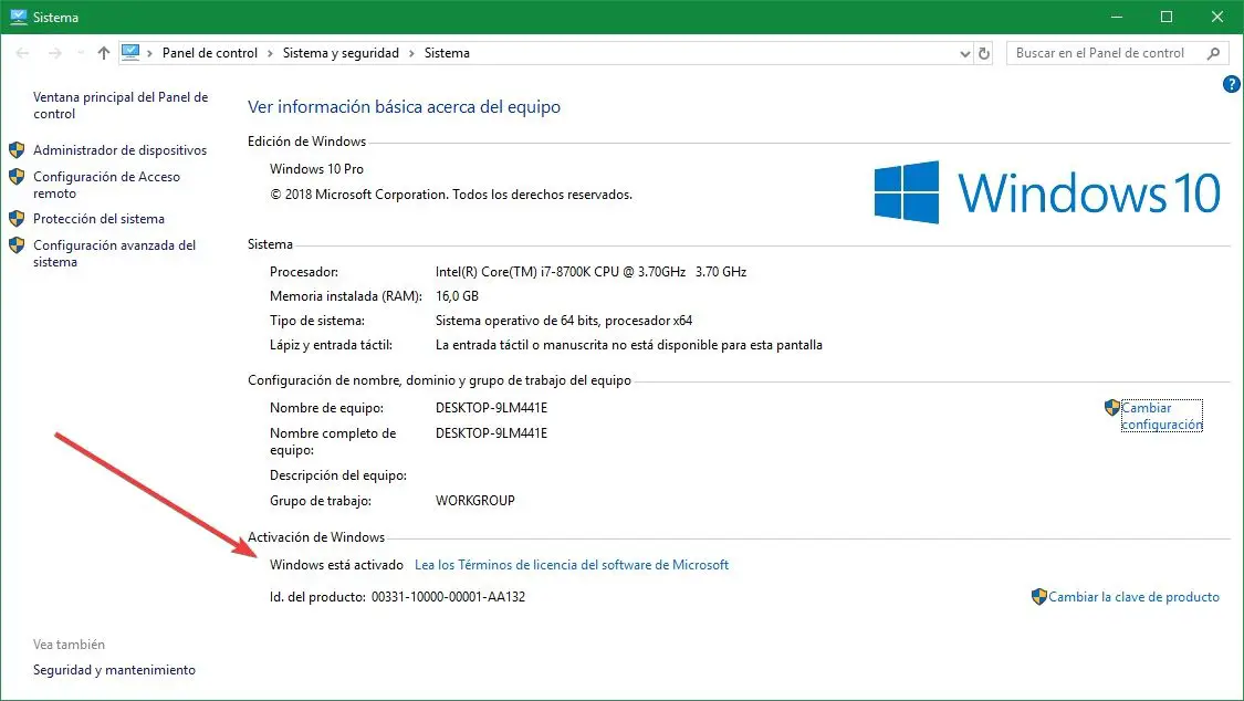 Если появляется это сообщение, первое, что нужно сделать, это проверить статус лицензии нашей Windows 10. Для этого мы нажмем сочетание клавиш. Windows + break и мы посмотрим на окно, которое показывает состояние нашей лицензии. Окна активирован он или нет.