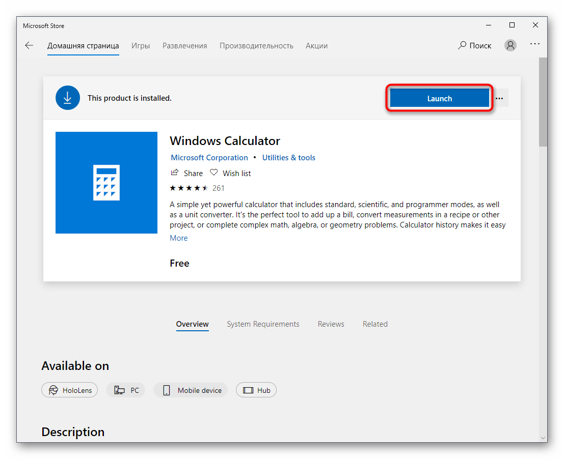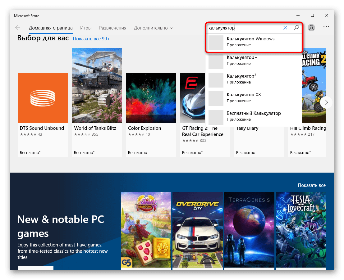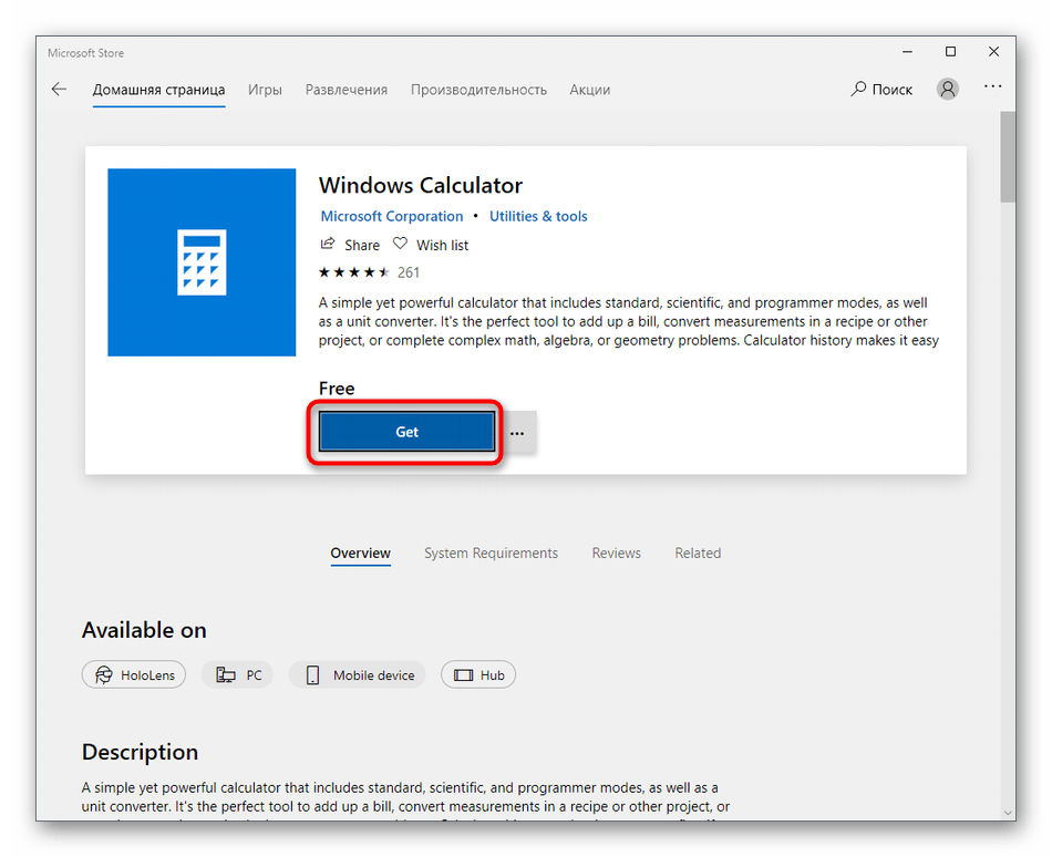 а) Войдите в Магазин Windows (Windows Store) и найдите калькулятор в разделе «Приложения и игры». Нажмите на кнопку «Установить», чтобы загрузить и установить калькулятор снова.