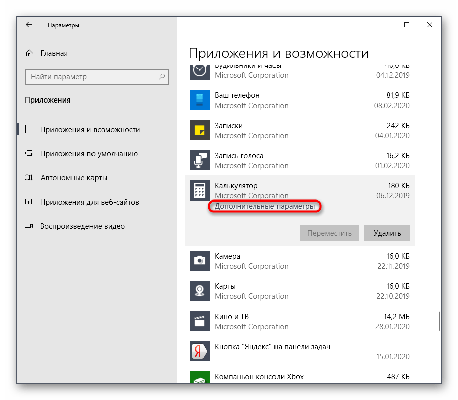 Отыщите там «Калькулятор» и откройте его дополнительные параметры.