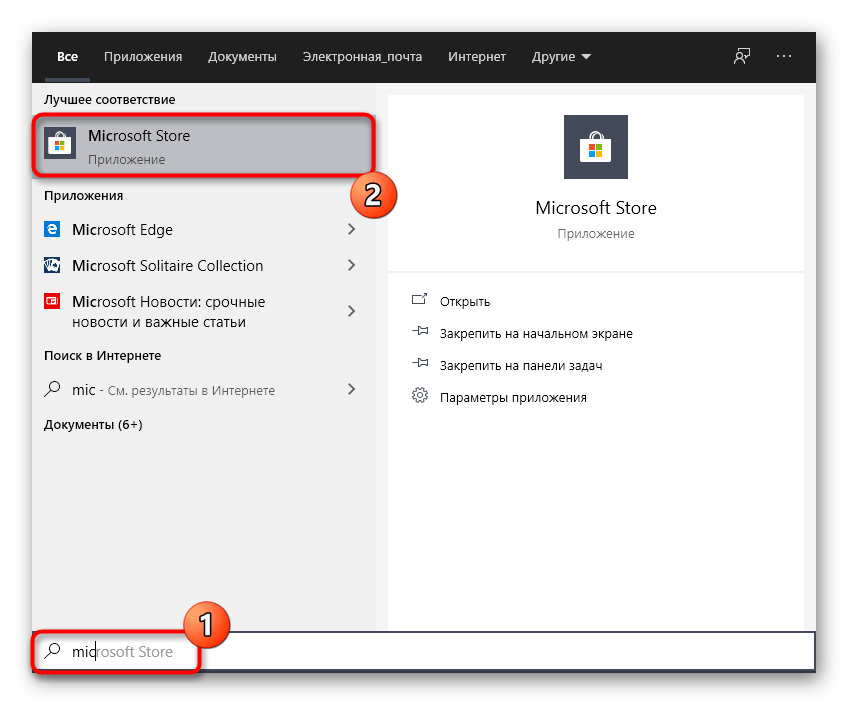 Через поиск в «Пуск» отыщите «Microsoft Store» и запустите этот магазин.