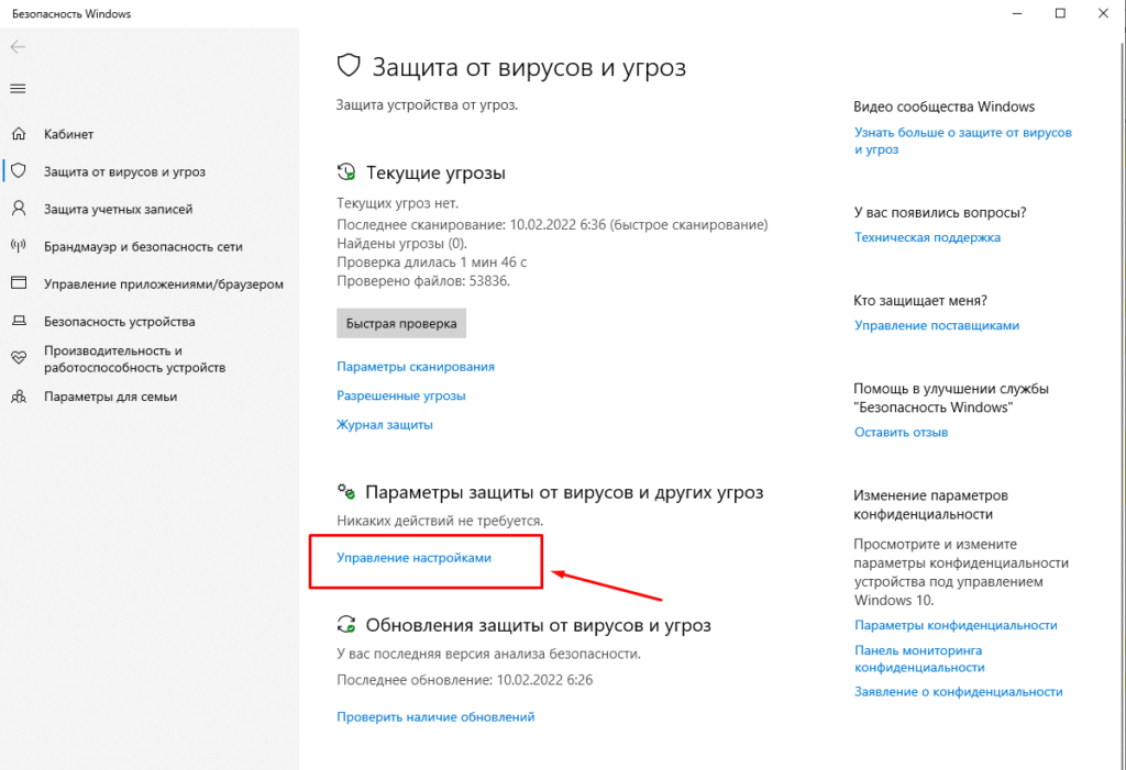 - Теперь найдите пункт “Параметры защиты от вирусов и угроз” и кликните “Управление настройками”.
