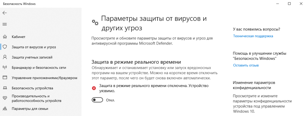 - А затем отключите “Защиту в реальном времени”, как показано на рисунке ниже.