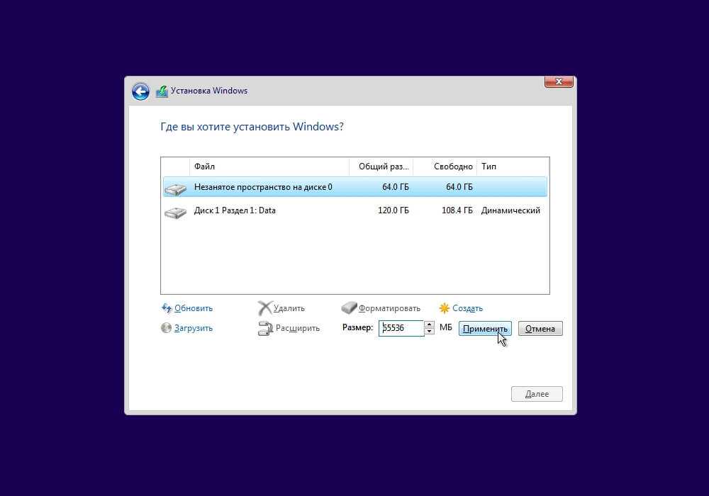 Выберите диск или раздел, который хотите отформатировать и установить на него ОС. Если ваш физический диск ещё не разбит на логические, предварительно нужно будет создать разделы или единственный раздел на весь диск. Выберите носитель, нажмите «Создать», укажите размер и нажмите «Применить».