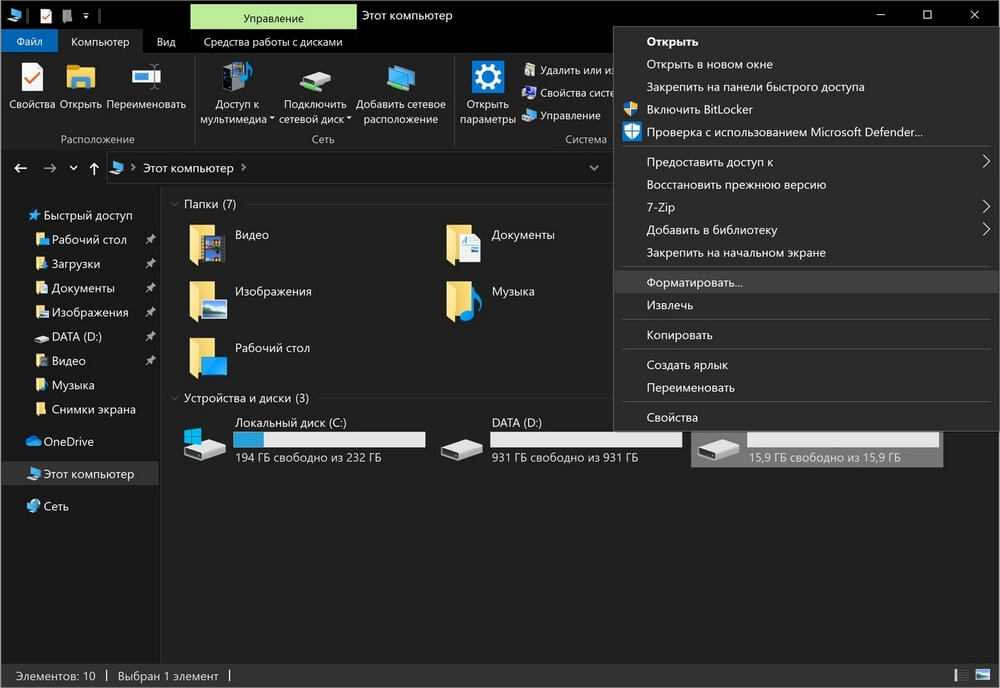 Самый простой способ отформатировать диск или раздел — через контекстное меню Проводника.