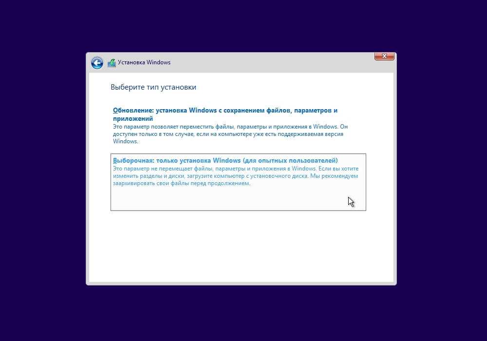 На этапе выбора типа установки кликните по пункту «Выборочная: только установка Windows».