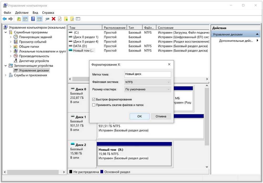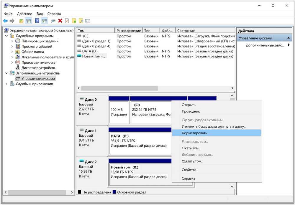 Другой способ форматирования — использование функции «Управление дисками» из встроенной в Windows системы администрирования. Этот способ особенно подходит, если речь идёт о новом неподготовленном жёстком диске. Дело в том, что если диск не размечен и не активирован в текущей ОС, то он не будет виден в «Проводнике» или в командной строке для утилиты Format, но его всё равно можно настроить через «Управление дисками».