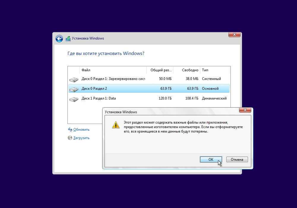 На следующем этапе или если у вас уже был ранее создан раздел, необходимо выбрать его и нажать «Форматировать». Инсталлятор Windows предупредит, что все данные будут уничтожены. Подтвердите это, и всё дальнейшее установщик сделает сам, вам необходимо просто продолжить инсталляцию ОС.