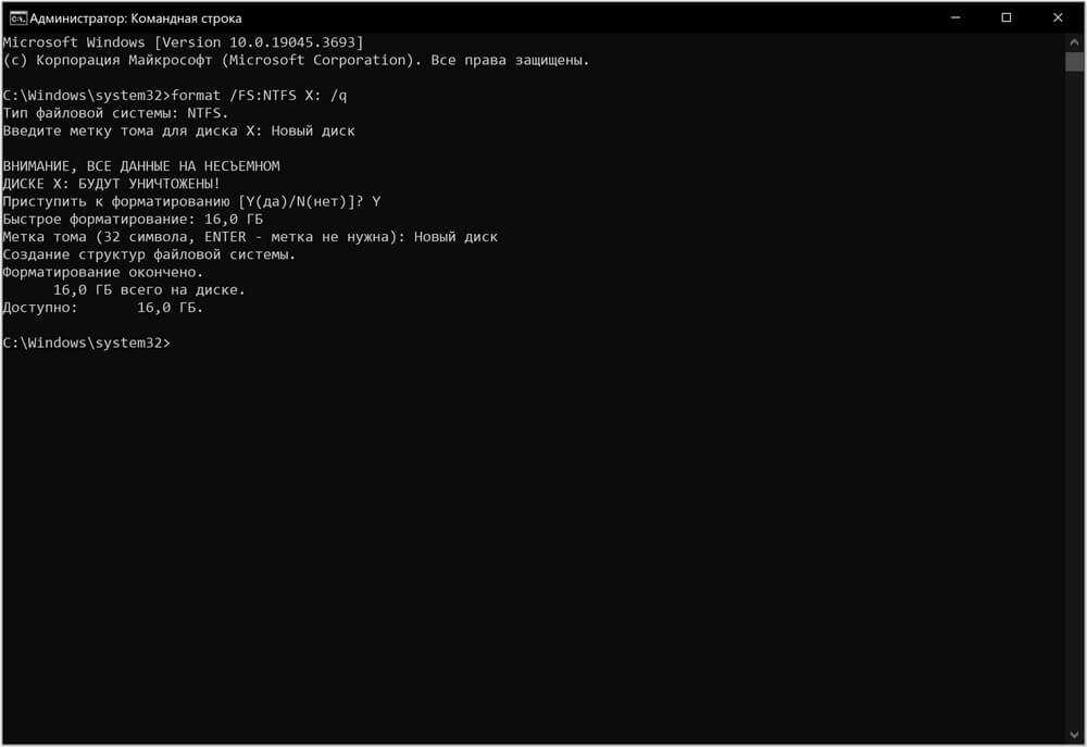 , где — буква форматируемого диска, а — параметр быстрого форматирования. Если последний не указать, будет выполнено полное (медленное) форматирование;