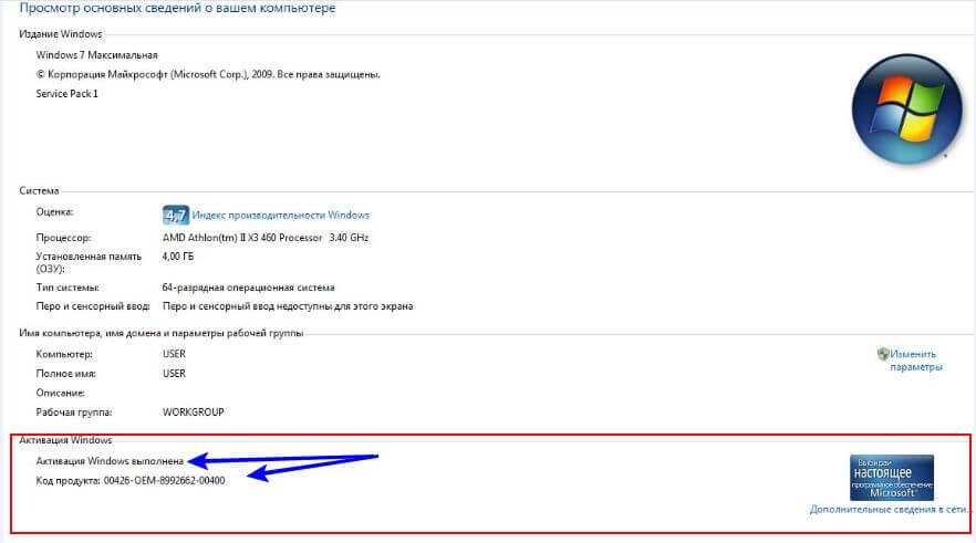 Для того, что бы окончательно убедиться в этом, проведите следующую операцию: кликните «Компьютер» — «Свойства системы» и в открывшемся окне внизу увидите подтверждение благополучно состоявшейся операции: